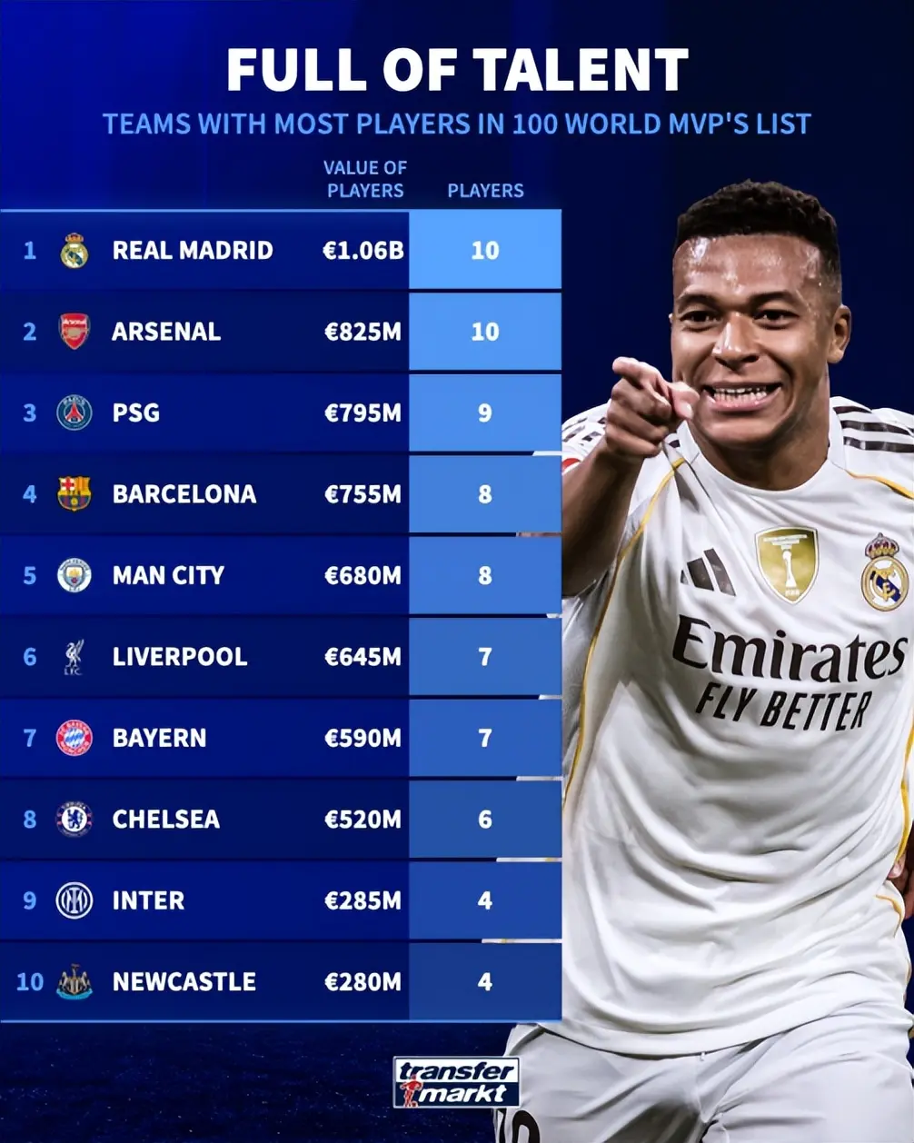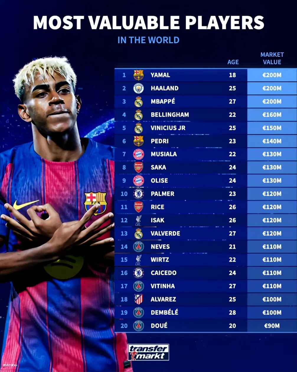 | 周五,《转会阛阓》公布2025年球员身价百强排名榜,18岁的亚马尔排名榜首,力压身价相同为2亿欧元的哈兰德、姆巴佩。  左证《转会阛阓》的端正,球员身价换取期,年岁更小的球员排名更高,这让18岁、身价达到2亿欧元的亚马尔排名榜首。 《转会阛阓》指出,“尽管只须18岁,但亚马尔为巴萨2次获取西甲冠军,况且随西班牙国度队获取2024年欧洲杯。”  25岁的哈兰德以2亿欧元的身价排名第二位,而27岁的姆巴佩则排名第3位,贝林汉姆、维尼修斯隔离以1.6亿、1.5亿的身价排名第4、5位。 置身前10位的球员隔离是佩德里(1.4亿)、穆西亚拉(1.3亿)、萨卡(1.3亿)、奥利塞(1.3亿)和帕尔默(1.2亿)。在身价排名前100位的球员里,只须奥斯梅恩黑白五大联赛球员,奥斯梅恩以7500万欧元排名第42位。  皇马有10名球员置身前100位,这让皇马排名悉数球队之首体育赛事直播,其次隔离是巴黎圣日耳曼(9东谈主)、巴萨(8东谈主)、曼城(8东谈主)、利物浦(7东谈主)、拜仁(7东谈主)、切尔西(6东谈主)。